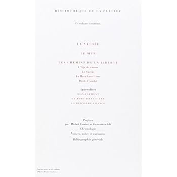4 unité(s) de cet article soldée(s) à partir du 8 janvier 2020 8h (uniquement sur les unités vendues et expédiées par Amazon)Voici le sommaire de ce volume : - Préface, chronologie, note sur la présente édition. - La Nausée. Le Mur. Les Chemins de la liberté : I. L'Âge de raison ; II. Le Sursis ; III. La Mort dans l'âme ; IV. Drôle d'amitié. - Appendices : Dépaysement ; La Mort dans l'âme (fragments de journal) ; La Dernière Chance (fragments). - Notices, notes et variantes. Bibliographie générale. La part de l'inédit dans ce volume est importante. Elle est constituée d'abord par l'intégralité des passages de La Nausée supprimés par Sartre. Puis par la nouvelle Dépaysement retirée in extremis du recueil Le Mur. Par le journal de guerre intitulé La Mort dans l'âme. Enfin par des fragments de ce qui devait être le tome IV des Chemins de la liberté. Inédits aussi certains documents publiés avec les notes, comme la correspondance entre Sartre et son éditeur à propos de La Nausée et une précieuse série de lettres à Simone de Beauvoir concernant la rédaction de L'Âge de raison.